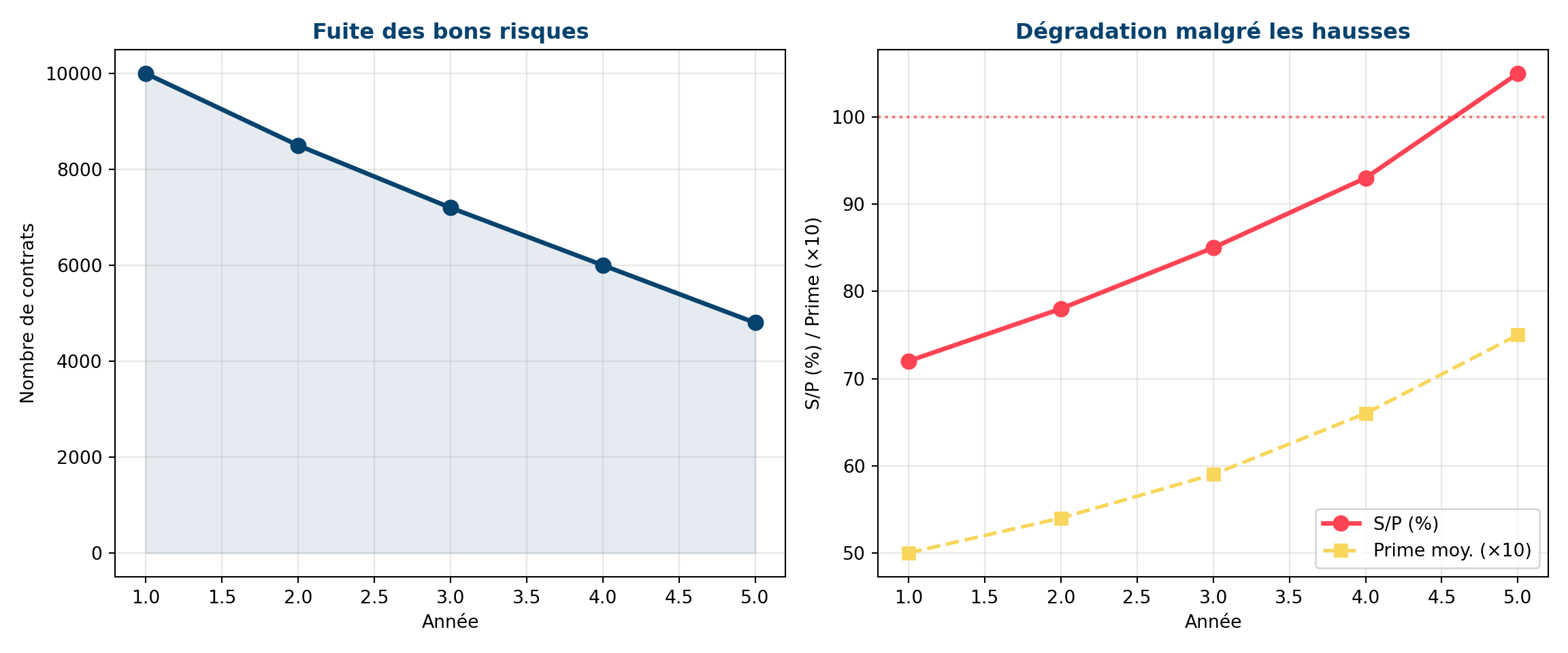 La détection de l’anti-sélection est un problème de data science : analyser les flux entrée/sortie du portefeuille, segmenter les résiliants, modéliser le churn par profil de risque, et ajuster la tarification en conséquence. C’est exactement ce que tu feras dans ton projet central.